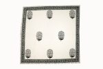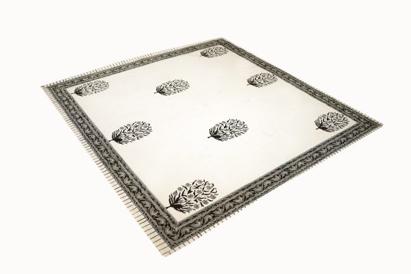 Black & grey floral buta design block printed on white background base. Having Black & grey floral bel at border. Vibrant colours give an elegant look. Fastened colours make it easy to wash. Available in square, rectangle and round variants..