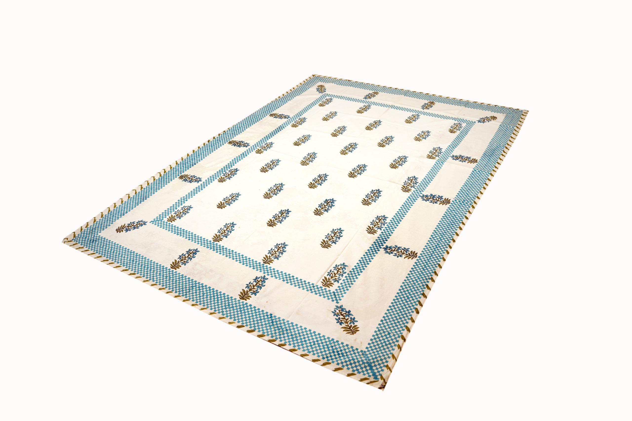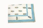 Blue & Green leaves design block printed on white background base. Vibrant colours give an elegant look. Fastened colours make it easy to wash. Available in square, rectangle and round variants.