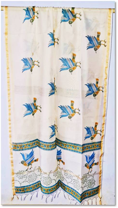 High quality ChanderI Silk Hand block printed Dupatta. Blue flying bird with white base. Very soft & shinny material with beautiful wildlife unique design gives nice look.
