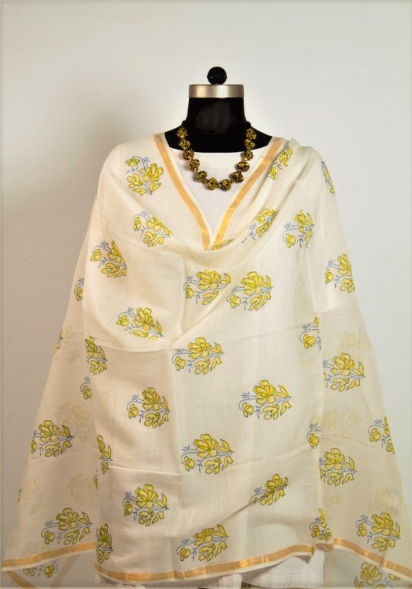 High quality Chanderi Silk Hand block printed Dupatta. Lemon yellow colour flower design with white base. Very soft & shinny material with beautiful design gives nice look.