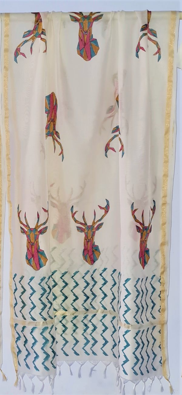 Multi-Colour Deer Face Design White Colour Chanderi Silk Dupatta