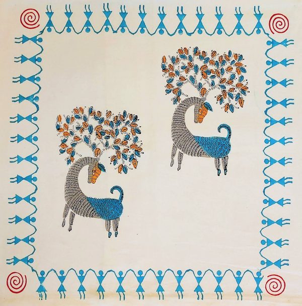 High quality Hand block printed white Cushion cover. Pair of Deer design at centre print with warli design in sky blue border. Very soft material looks beautiful with wildlife & traditional touch.