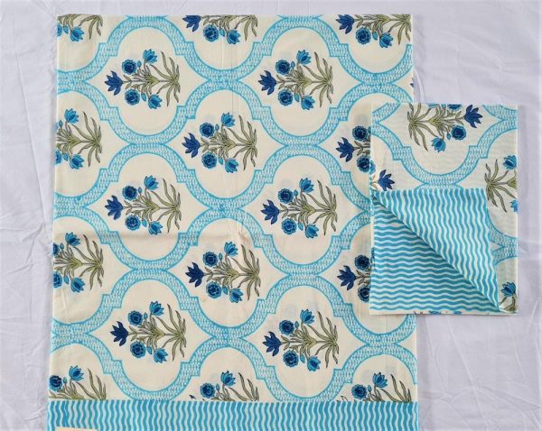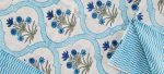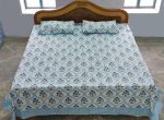 Premium quality bed sheet with sky blue floral buta block printed on white cotton base, with light blue striped border. Each bed sheet comes with matching pillow covers. Vibrant colors of these bed sheets will complement the décor of your bedroom. Gives an ethnic touch to your room. Fastened colors make it safe for washing.