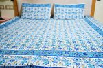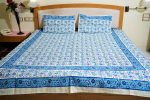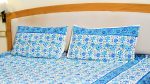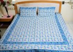 Premium quality bed sheet with Turquoise blue & Blue floral jaal design block printed on white cotton base, with Floral bel border. Each bed sheet comes with matching pillow covers. Vibrant colors of these bed sheets will complement the décor of your bedroom. Gives an ethnic touch to your room. Fastened colors make it safe for washing.