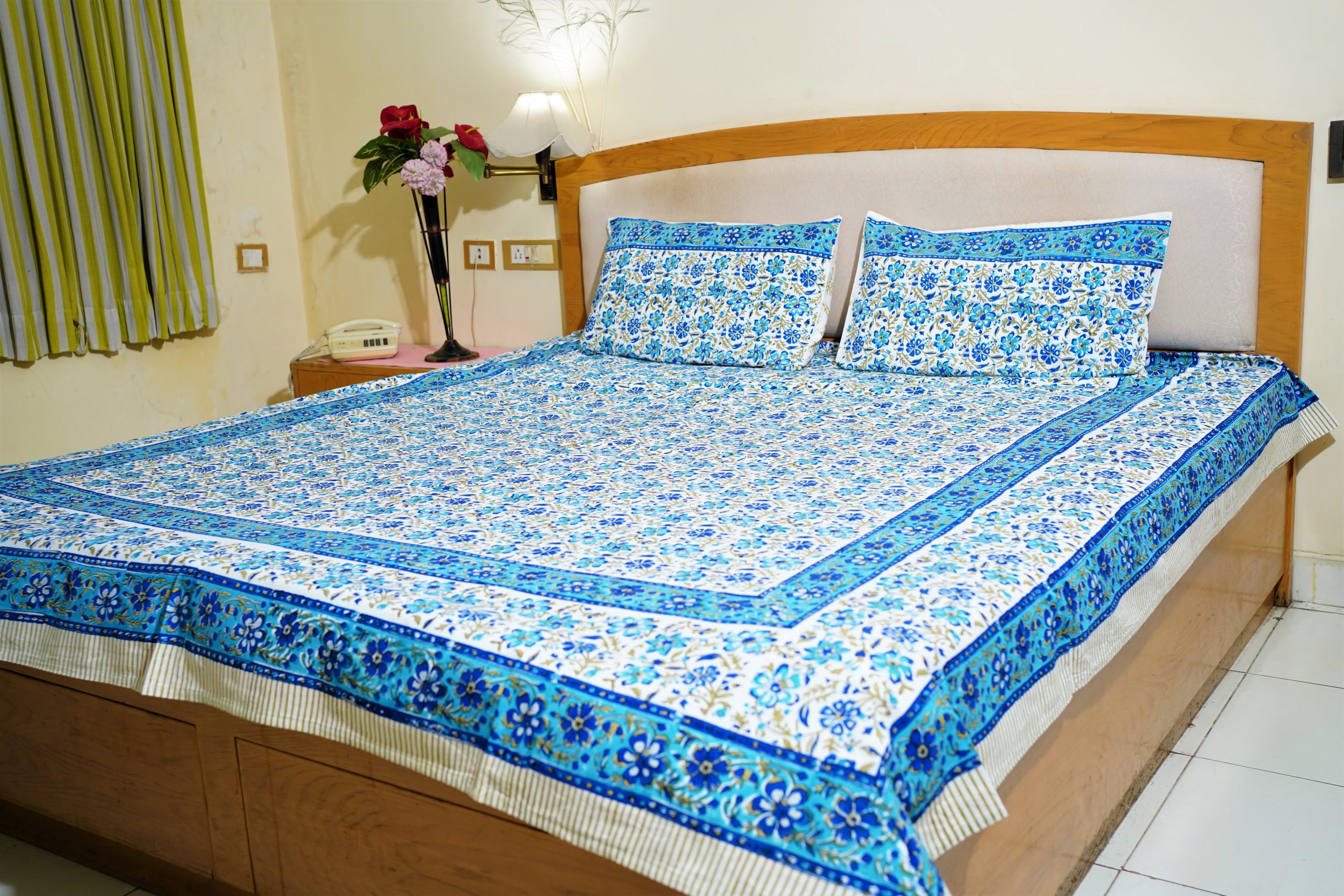 Premium quality bed sheet with Turquoise blue & Blue floral jaal design block printed on white cotton base, with Floral bel border. Each bed sheet comes with matching pillow covers. Vibrant colors of these bed sheets will complement the décor of your bedroom. Gives an ethnic touch to your room. Fastened colors make it safe for washing.
